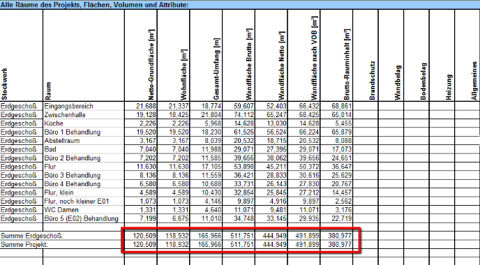Automatische Projektauswertung in Form von Übersichtstabellen und Flächen- und Materialzusammenzug.